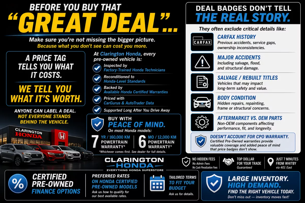 At Clarington Honda, we pride ourselves on offering competitive and transparent pricing, supported by our A Plus Pricing" model, backed by trusted platforms like CarGurus and AutoTrader.